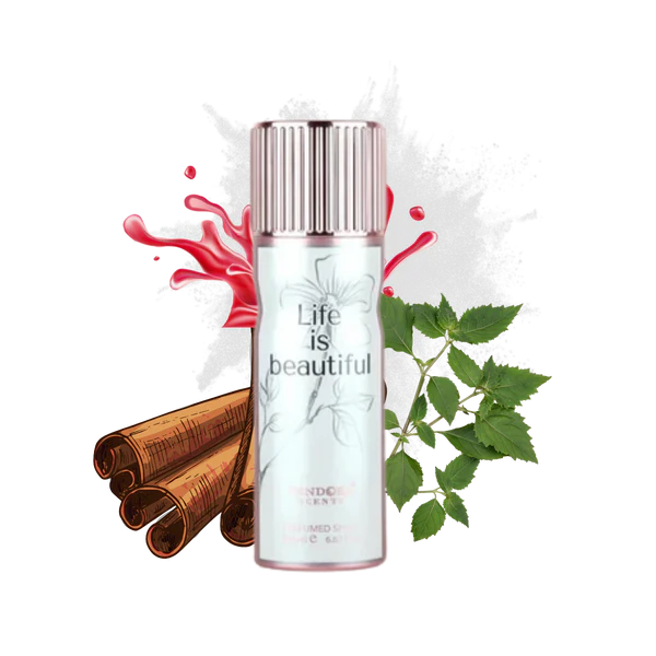 LIFE IS BEAUTIFUL Deo is an uplifting fragrance that captures the essence of happiness, confidence, and grace. It opens with radiant notes of pear and blackcurrant, creating a fresh and sparkling introduction. The heart blooms with soft jasmine and iris, adding a touch of delicate femininity. As it settles, warm praline, tonka bean, and vanilla wrap the scent in a comforting, elegant sweetness. Designed for the woman who embraces life with a smile, LIFE IS BEAUTIFUL is more than a deodorant.It’s a daily reminder that every day holds beauty worth celebrating.