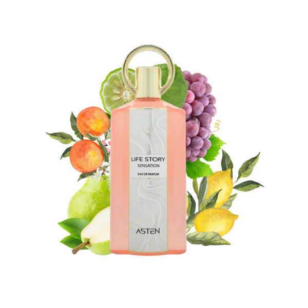 LIFE STORY SENSATION by ASTEN is a fragrance that celebrates life’s most beautiful moments. It opens with sparkling notes of bergamot, peach, and red berries, creating a bright and joyful introduction. The heart reveals an elegant bouquet of jasmine, rose, and lily, weaving a tale of grace and sophistication. As it settles, soft musk, amber, and creamy vanilla add warmth and depth, leaving a lasting, sensual impression. Uplifting, elegant, and full of emotion, LIFE STORY SENSATION ASTEN is more than a perfume it’s a journey through memories, feelings, and timeless beauty.